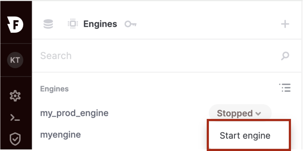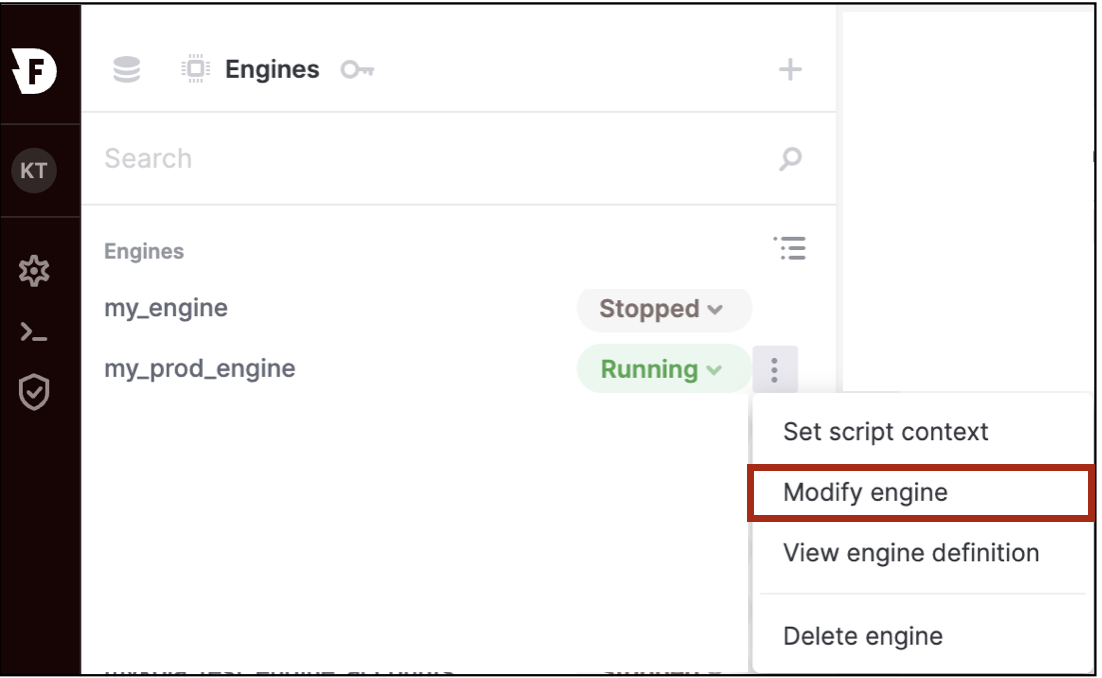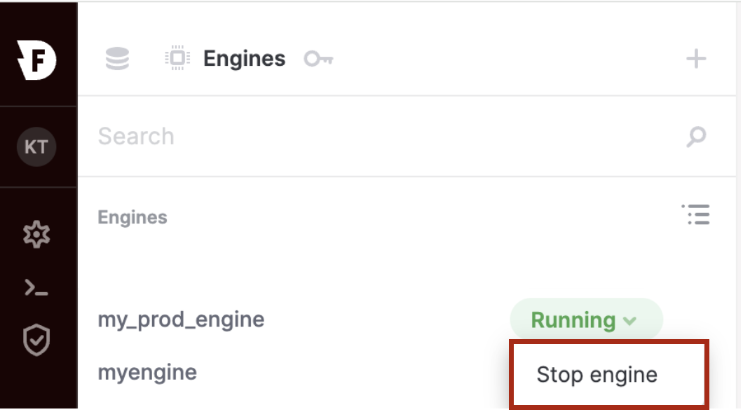 To stop an engine, use the STOP ENGINE command:Stopping an engine clears its cache. Queries run after restarting will experience a cold start, potentially impacting performance until the cache is rebuilt.