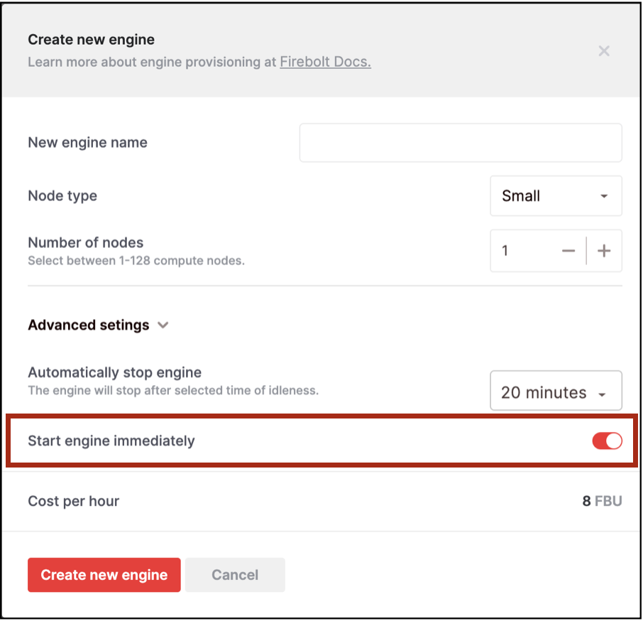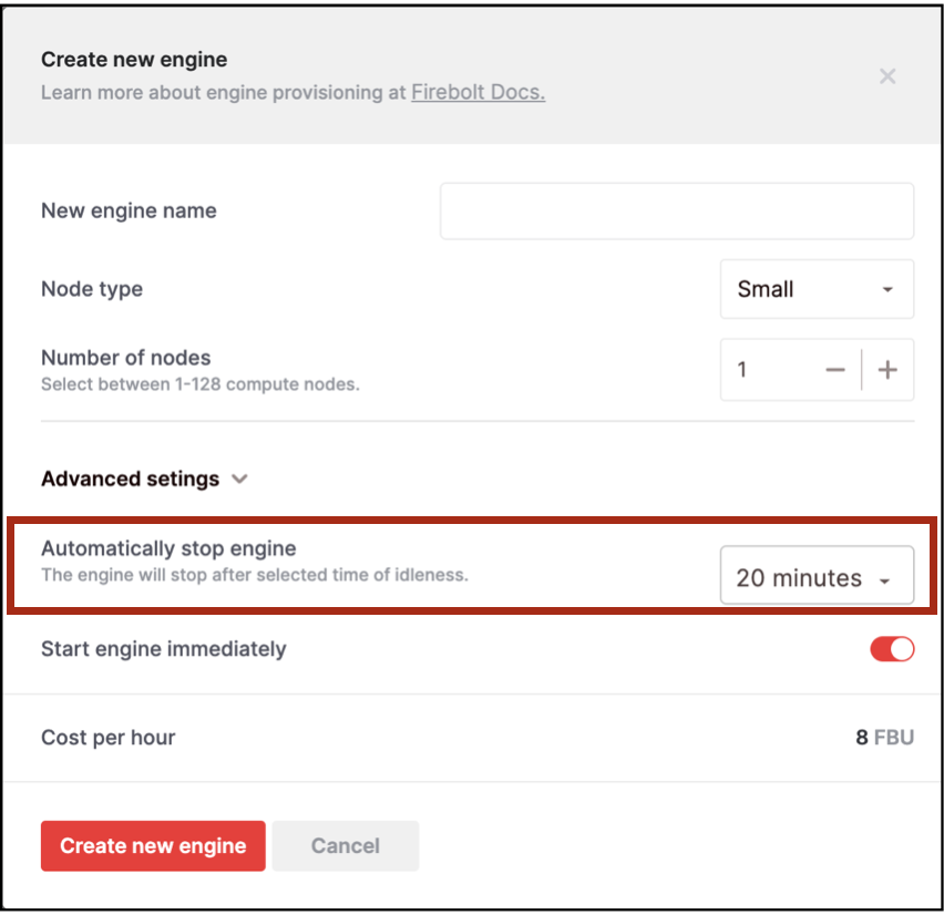 You can configure an engine to start automatically after creation and to stop after a set idle time.Configure automatic start/stop using the UI